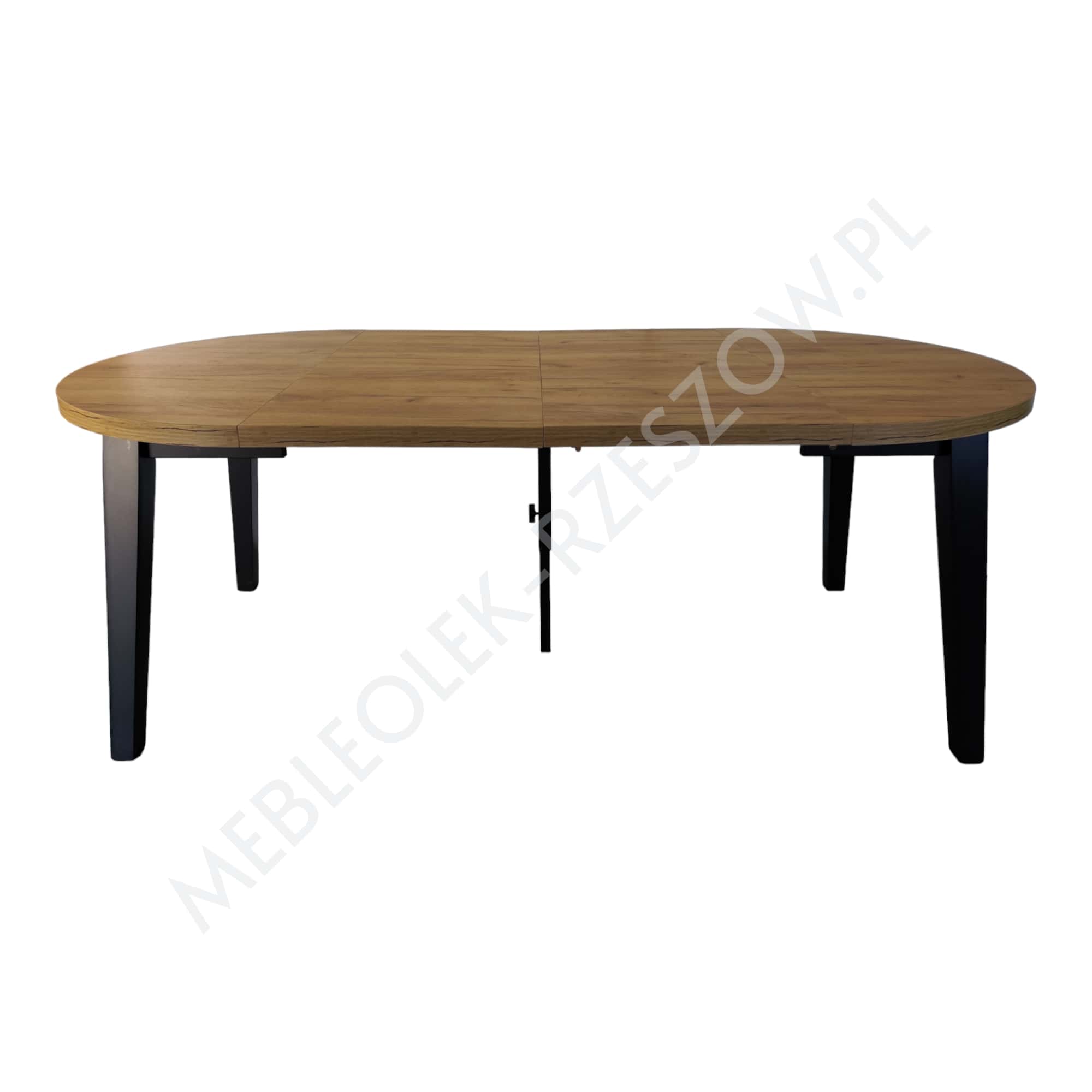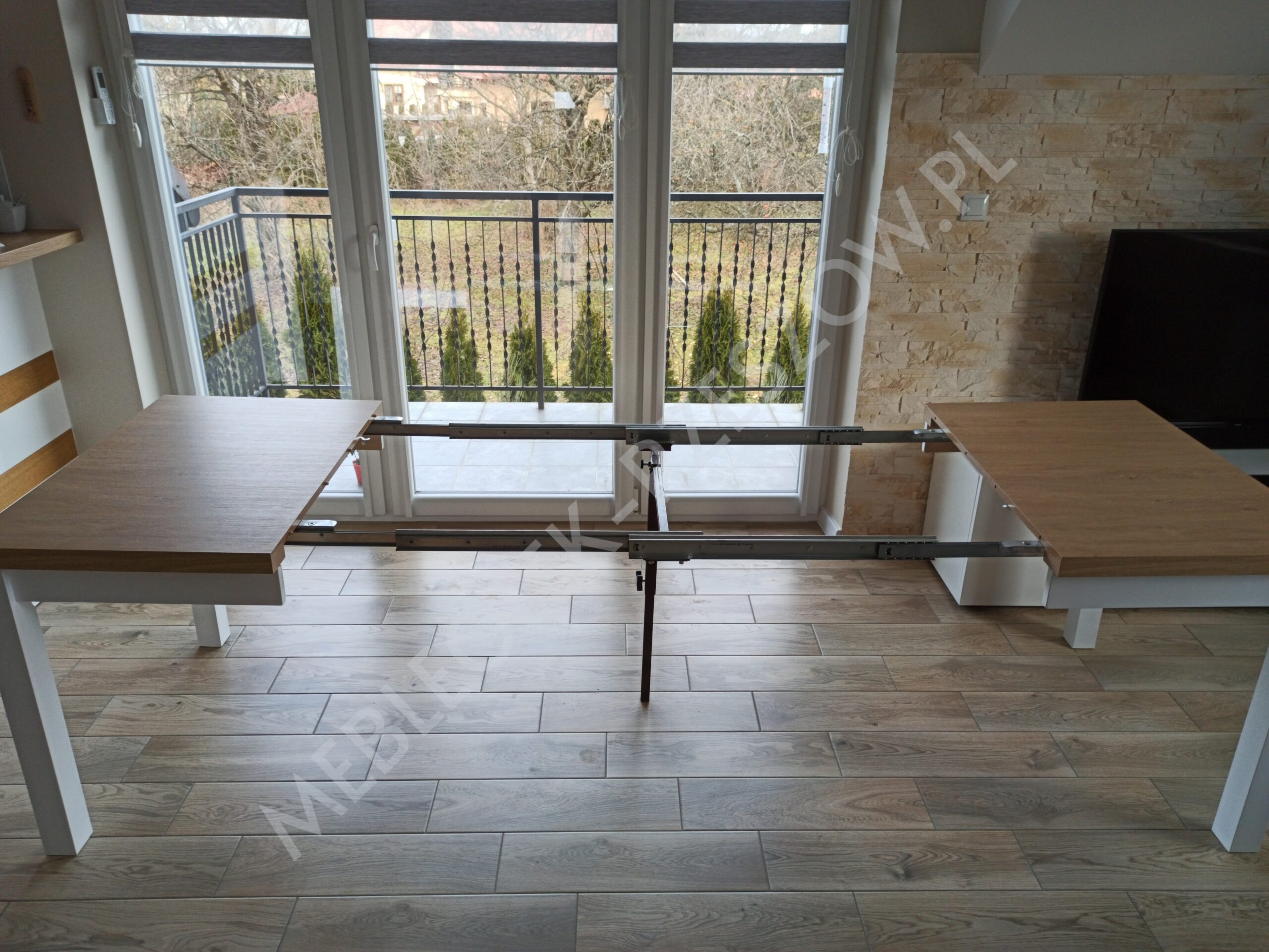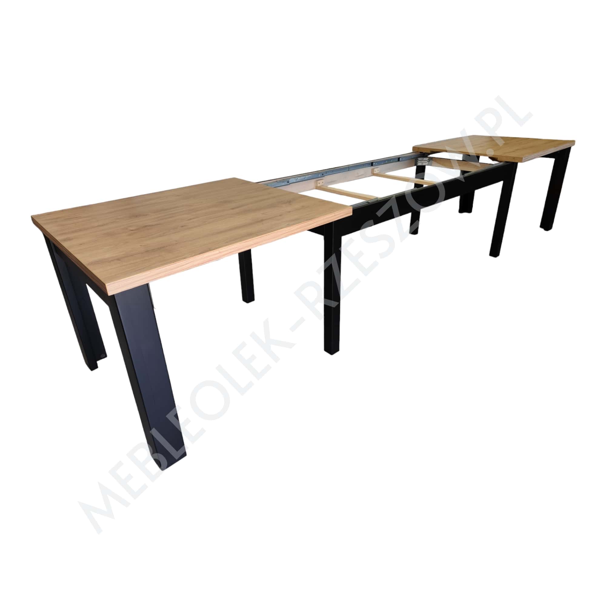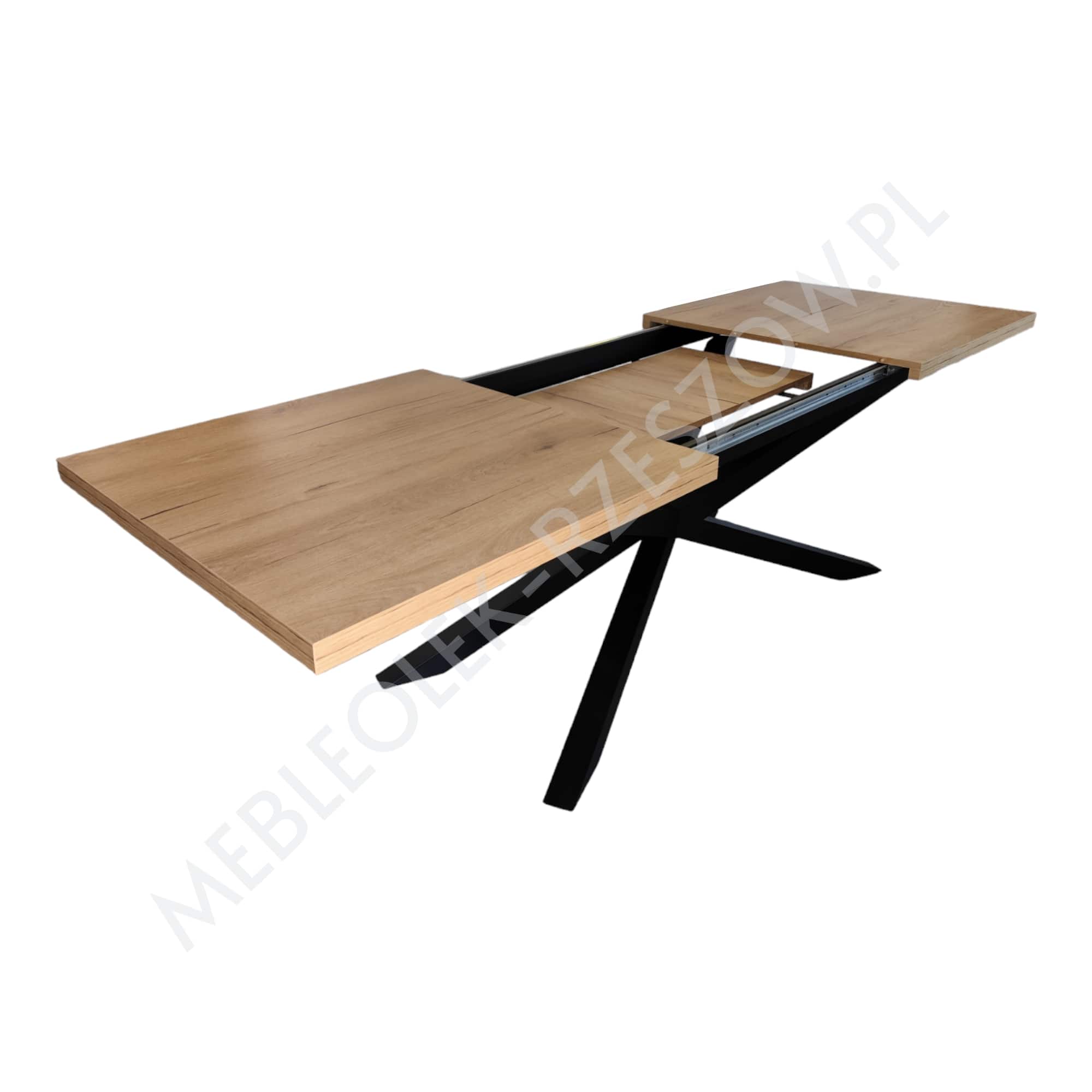 Prowadnica ułatwiająca rozkładanie stołu. Brzegi blatu wykończone okleiną ABS/PCV – pogrubienie 3,6cm lub 5 cm . 2 wkłady chowane pod głównym blatem, 2 do przechowywania osobno Stół posiada 8 nóg, wsuwane jedna w drugą