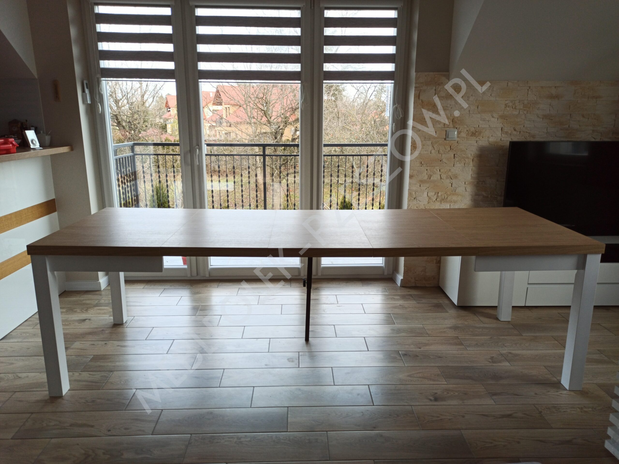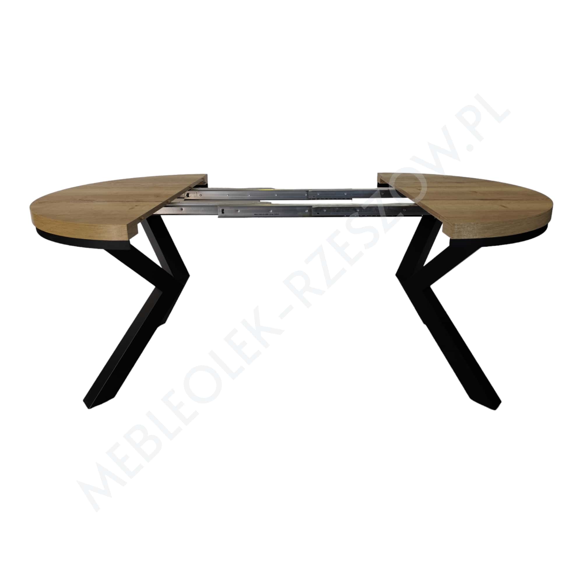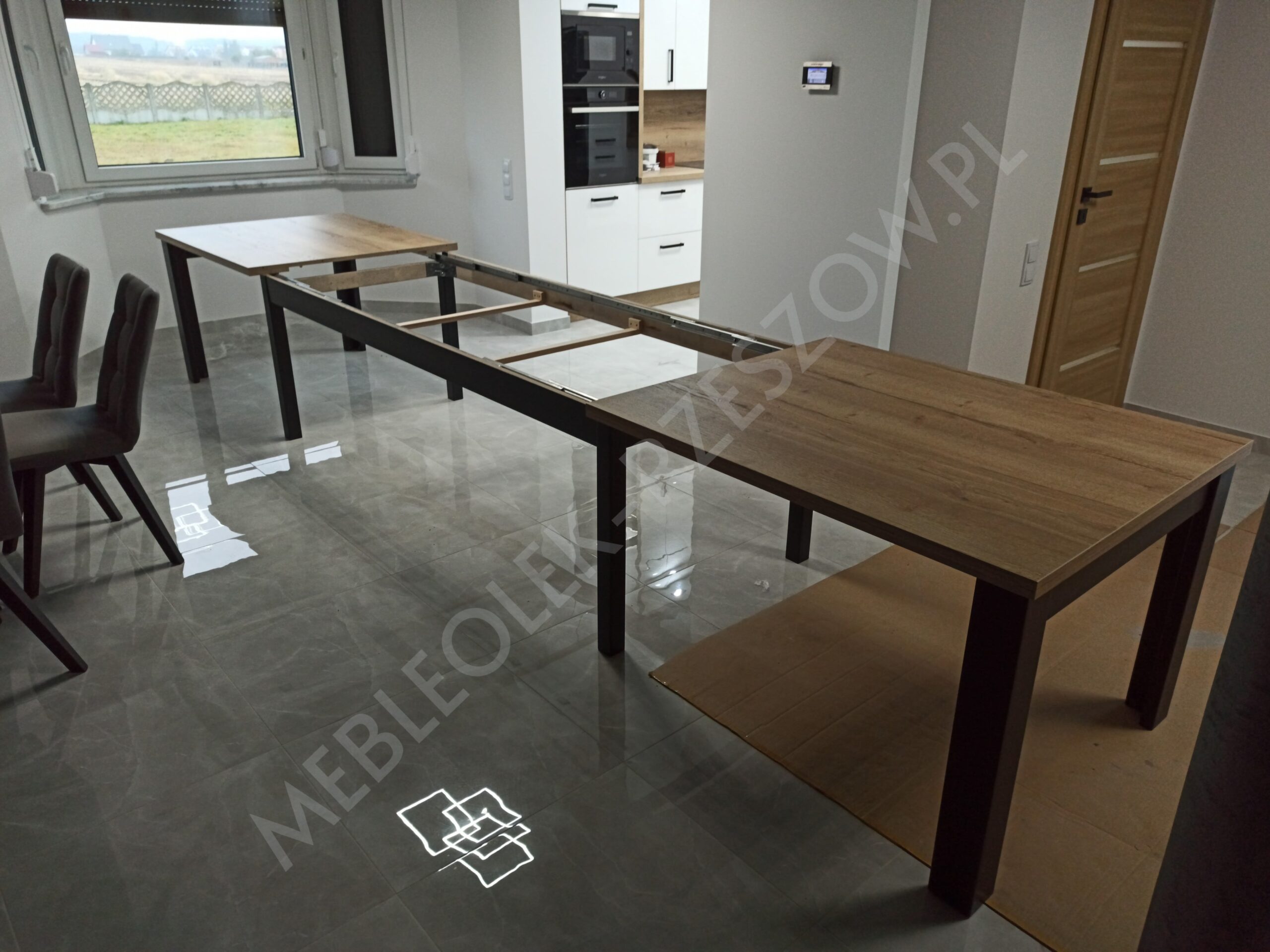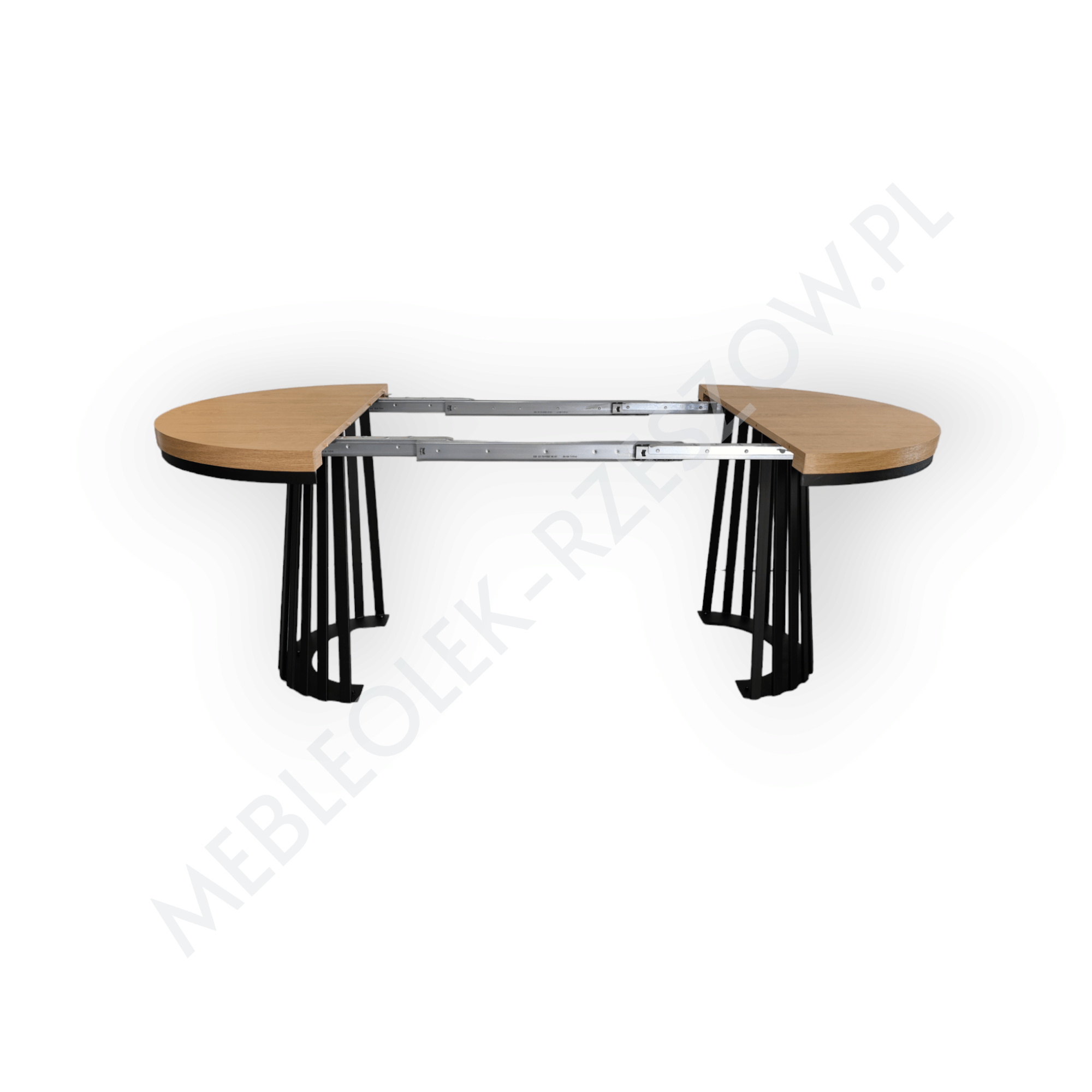 Prowadnica ułatwiająca rozkładanie stołu. Brzegi blatu wykończone okleiną ABS/PCV – pogrubienie 3,6cm lub 5 cm . 2 wkłady chowane pod głównym blatem, 2 do przechowywania osobno Stół posiada 8 nóg, wsuwane jedna w drugą